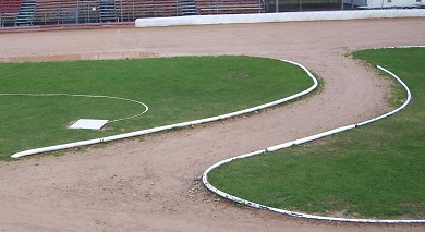 Our track is a 1/14th mile clay dirt track constructed in the shape of a tri-oval. Since our track sits on Pocono Raceway property its shape emulates that of the large track. The start/finish line is located at the center of the main or front straight, and the track is wide enough to accommodate passing anywhere. Cars enter the track at the top of turn 3 and exit at the top of turn 1. There is a hot chute located in the infield between the entrance to turn 2 and the center of the main straight. This allows the handlers to work on the cars without having to exit and re-enter the track using the exit and entrance ramps. The track is surrounded by a heavy duty extruded plastic guard rail and a 6' chain link fence. The exits of turns 1 and 3 have a soft wall system installed in front of the guard rail.