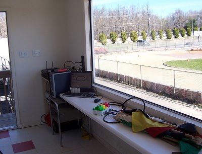 The scoring tower is the nerve center of the track operations and sits above and behind the main grandstand. Behind the window in the front section is a long desk where the scorers sit to score the race, keep track of the laps, and order the cars for restarts. The Club uses a scoring computer and AMB transponders on each car as the main scoring system, but a team of scorers also scores each race as a backup. A view from inside the tower is shown below. The scoring computer and public address system is seen on the left. All announcements as well as the calling of each race are done from the tower.